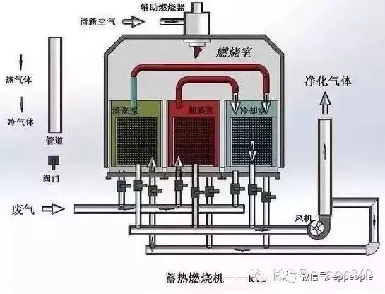 圖為RTO(蓄熱式熱力焚燒技術(shù))濃縮及廢熱回收系統(tǒng),可將低濃度、大風(fēng)量的VOCs廢氣濃縮為高濃度、小風(fēng)量的廢氣,然后高溫燃燒,并將儲熱體的熱量重新回收,利用在廢氣預(yù)熱和熱轉(zhuǎn)換設(shè)備上。